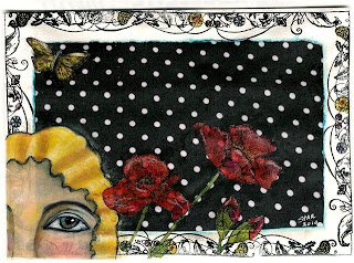 Both faces were on tracing paper lining my art tables. They were both just practice, sort of doodling things but I decided I liked them and so saved them to use. Flowers and butterflies are napkins and then the usual caran d'ache for the faces, colored pencil and stamps.